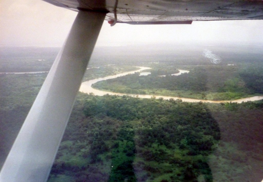 On the map we spot a river, Rio Patuca, the source of it arises deep in the interior of the Country and flows into the sea on the Caribbean coast. Navigating up this river might be an exciting trip. However, we do not know whether this is really doable. On Utila we find no one who can give us any information about the area. So we head back to La Ceiba. In a travel agency we finally get some useful info on how to get to the area. There is no way to fly directly to the mouth of the River, but one Airline flies regularly from La Ceiba to a small village, called Brus Laguna, which is near the river. There we should be able to hire a canoe that takes us to a village at the mouth of the Rio Patuca. But they don’t know if the river is navigable, nor if there is another way to get any further from there. Doesn’t matter, we do it anyway. So we go ahead and buy two tickets. The next day we go Shopping for a few essentials we might need for our trip into the unknown. We buy mosquito nets, mosquito spray, candles etc. We don’t take any food with us, only one bottle of water each cos we expect that if the river trip is really feasible we can supply in the villages along the river. The next morning we`re up at 5:00 am, and at 6 we are already at La Ceiba airport. We feast on a big breakfast before departure because who knows when there will be the next meal!? 7.15 liftoff in a 15 seat airplane. It`s about 1 hours flight at 2000m cruising altitude. The weather is sunny, slightly hazy, but the view from this low altitude is terrific. Then we`re landing on an unpaved, bumpy natural runway in Brus Laguna. Shit now that was a shaky landing, happy to be safe on the ground. With us, three more people get off, and the plane flies on to Puerto Lempira. A few locals stand around observing us curiously, and there is also a jeep, our taxi. But the driver doesn’t want to go to town as yet, he wants to wait for the next plane to arrive in order to be able to drive even more passengers into the village. So we wait, sitting on our backpacks in the shadow of a small hut.